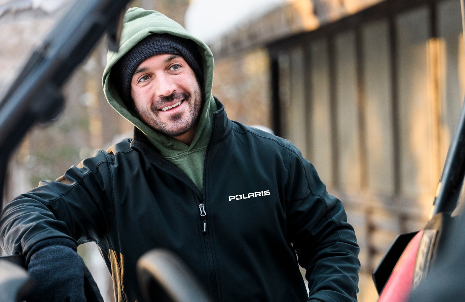 Man wearing a black Polaris jacket with a green hood, standing next to a vehicle.